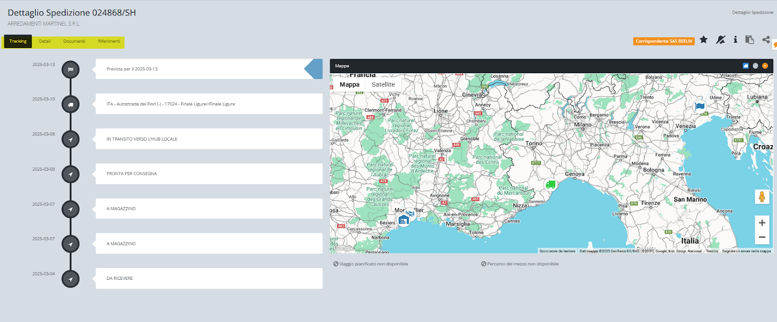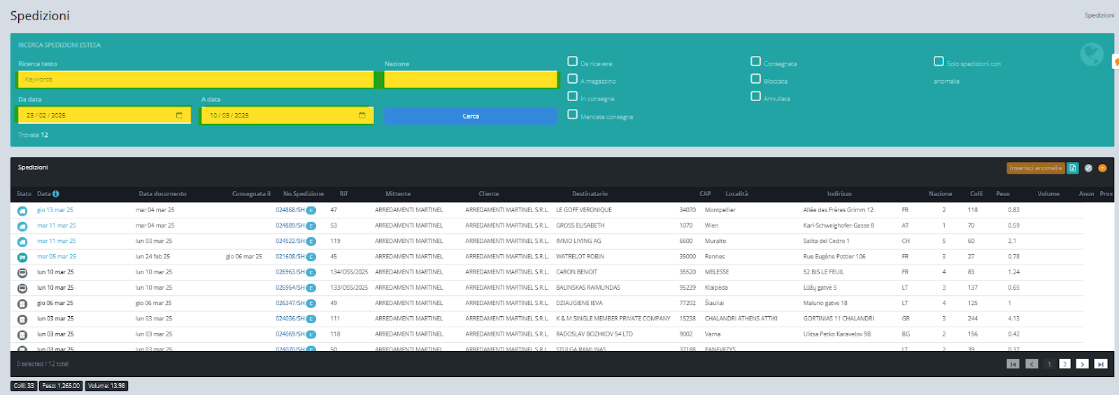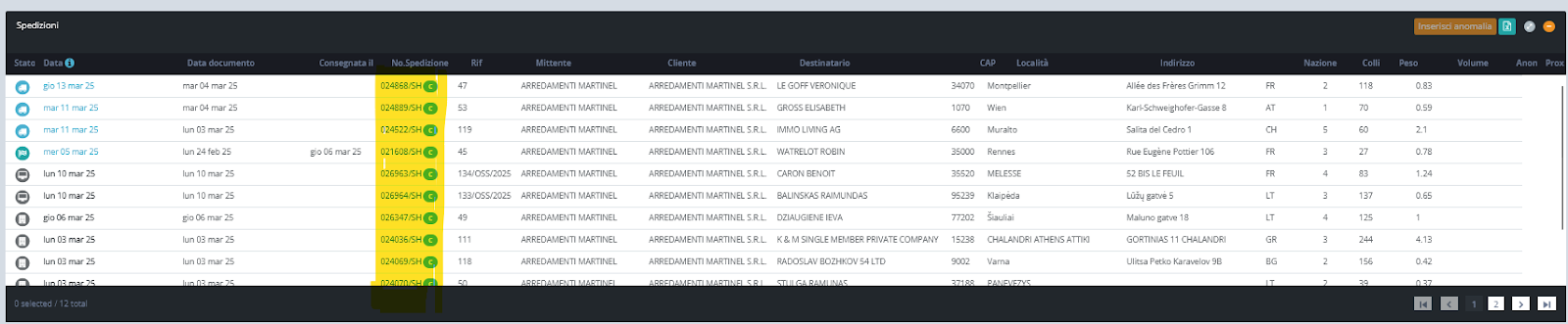 Clicchi sul numero della spedizione interessata per visualizzarne i dettagli (immagine sotto):